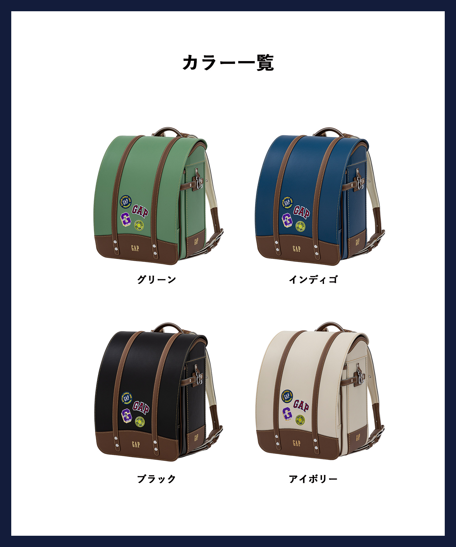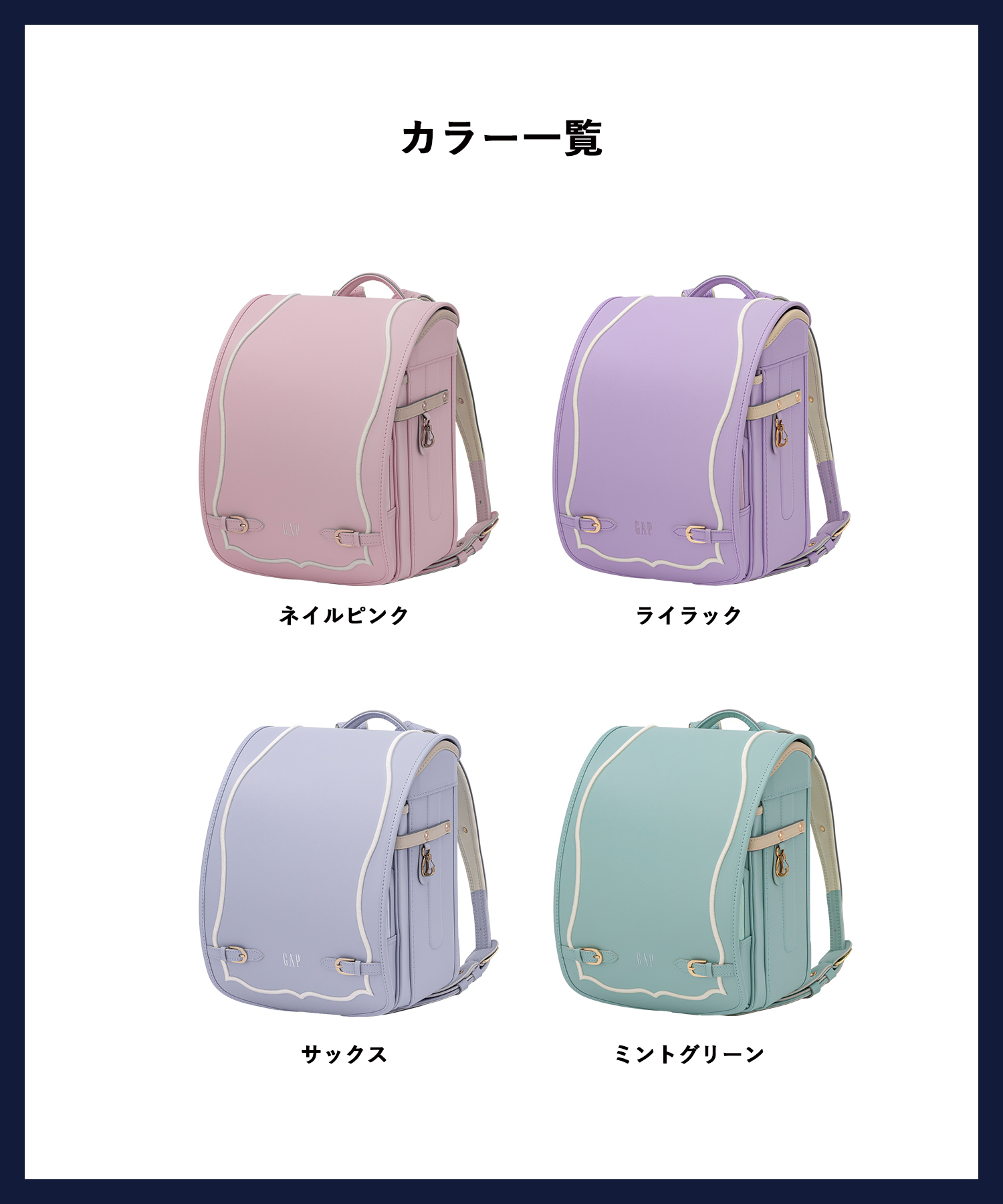 1969年にサンフランシスコで創業以来、モダンなアメリカン・カジュアルを提案し続けるGAPから2024年にランドセ ル&軽量ランドセル型リュックが新登場。シンプルながら快適な使い心地にこだわり、子供が活発に楽しめるよう に。また、再生繊維「エコペット🄬」を主素材として使用し、環境への配慮も行ったランドセルに仕上げました。